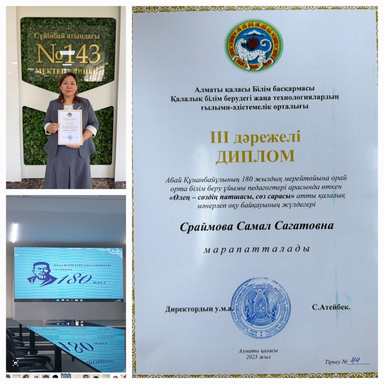 Алматы қаласы Білім басқармасы Қалалық білім берудегі жаңа технологиялардың ғылыми-әдістемелік орталығы Абай Құнанбайұлының 180 жылдық мерейтойына орай орта білім беру ұйымы педагогтері арасында өткен « Өлең –сөздің патшасы, сөз сарасы » атты қалалық мәнерлеп оқу байқауының III- дәрежелі дипломмен Сраймова Самал Сагатовна марапатталды.