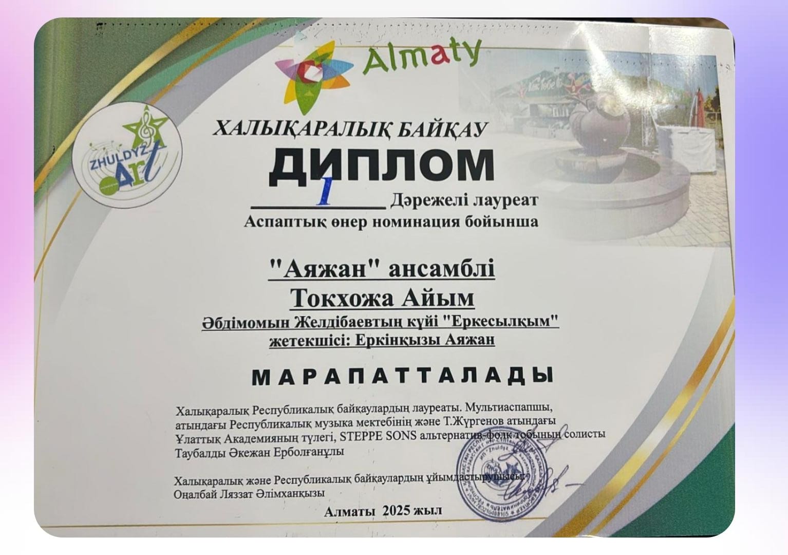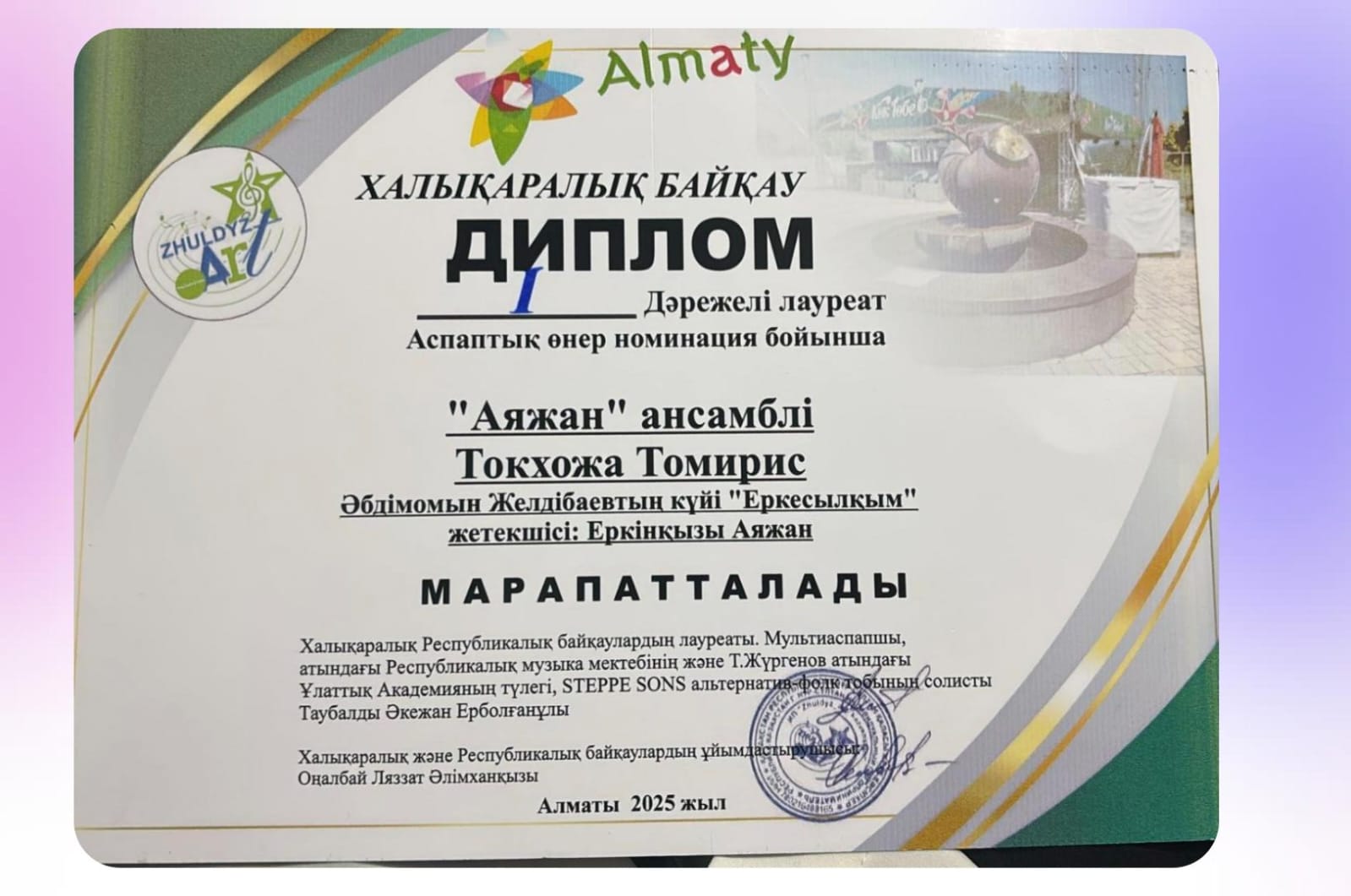 Алматы қаласы Сүйінбай атындағы N143 лицейдің 8"Ә" сынып оқушысы Токхожа Айым және 10"Д"сынып оқушысы Токхожа Томирис сабақтарынан тыс бос уақыттарында домбыра үйірмесіне қатысып, Қазақстан ішіндегі және шетел мемлекетіндегі Байқауларға қатысып өнерін көрсетіп жүлделі орын алып жүр. Сонымен қатар 1 Қараша 2025 жылы Алматы қаласында өткен Халықаралық "Zhuldyz Art Kazakhstan" балалар Байқауына қатысып өз өнерлерін көрсетіп Томирис және Айым 1 ші жүлделі орын алып желтоқсан айында Стамбул қаласы 2026 жылы Вьетнам қаласында өтетін Байқауға Лауреаттарымыз жолдама алды. Өнерлі шәкірттерімізді марапаттарымен шын жүректен жеңісімен құттықтаймыз! Биік шыңдарды ұлттық аспабымыз домбырамен бағындырып жүре беріңдер, тек алға, біз сендерге сәттілік тілейміз