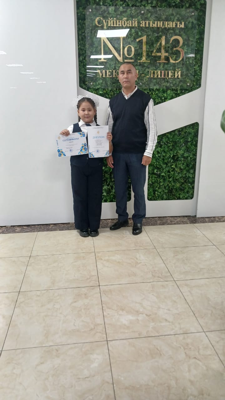 Алматы қаласы Білім басқармасы мен «Алматы дарыны» орталығының ұйымдастыруымен 10–16 қараша аралығында 5–11 сынып оқушыларына арналған «Полиглот» қалалық байқауында информатика пәнінен Сүйінбай атындағы №143 мектеп-лицейдің 5 сынып оқушысы Аблази Аяна ІІ орын дипломымен марапатталды. Жетекшісі Нургожаев Манат