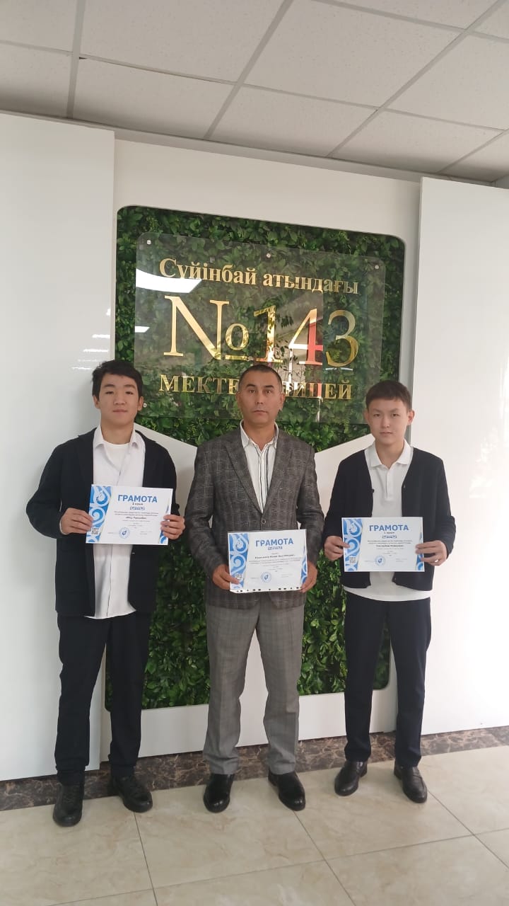 Алматы қаласы Жетісу ауданы Сүйінбай атындағы №143 мектеп-лицейдің 8-сынып оқушылары Әбіш Райымбек Тоқтарбай Мейіржан География пәнінен республикалық қашықтықтан олимпиада 1-орын иеленді. #Мектеп#Мақтанышы#Олимпиада#1орын