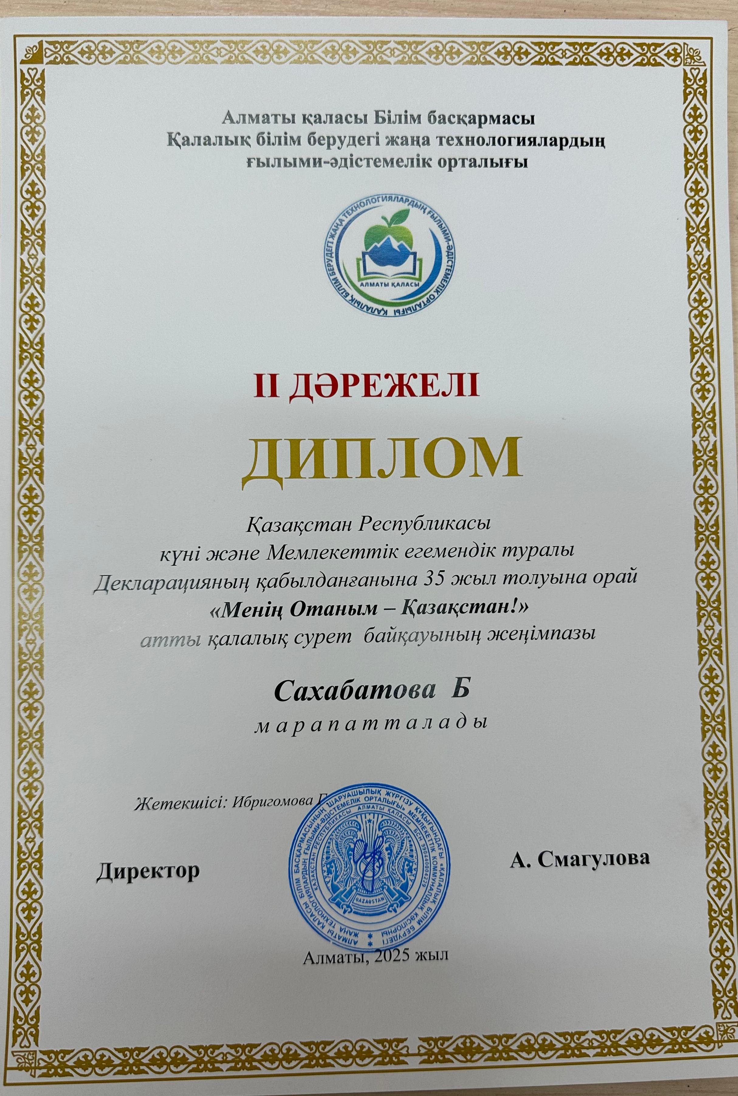 Қазақстан Республикасы күні және Мемлекеттік егемендік туралы Декларацияның қабылданғанына 35 жыл толуына орай "Менің Отаным-Қазақстан"атты қалалық сәндік -қолданбалы өнер байқауының жеңімпазы 10"В"сынып оқушысы Сахабатова Ботагөз Il Дәрежелі Дипломмен марапатталды.Құттықтаймыз!💐💐💐