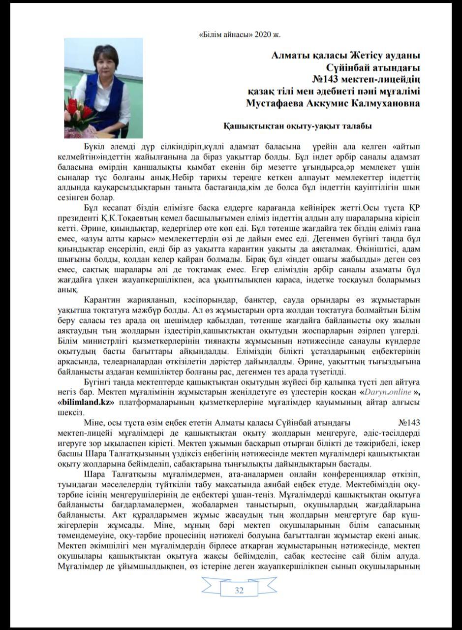 Жетісу аудандық білім бөлімінің жоспарына сәйкес Сүйінбай атындағы №143 мектеп-лицейдің қазақ тілі мен әдебиеті пәнінің мұғалімі Мустафаева Аккумис Калмухановна "BILIM AINASY" Республикалық журналына "Қашықтан оқыту-уақыт талабы" мақаласы мамыр айындағы №53 нөміріне жарияланды