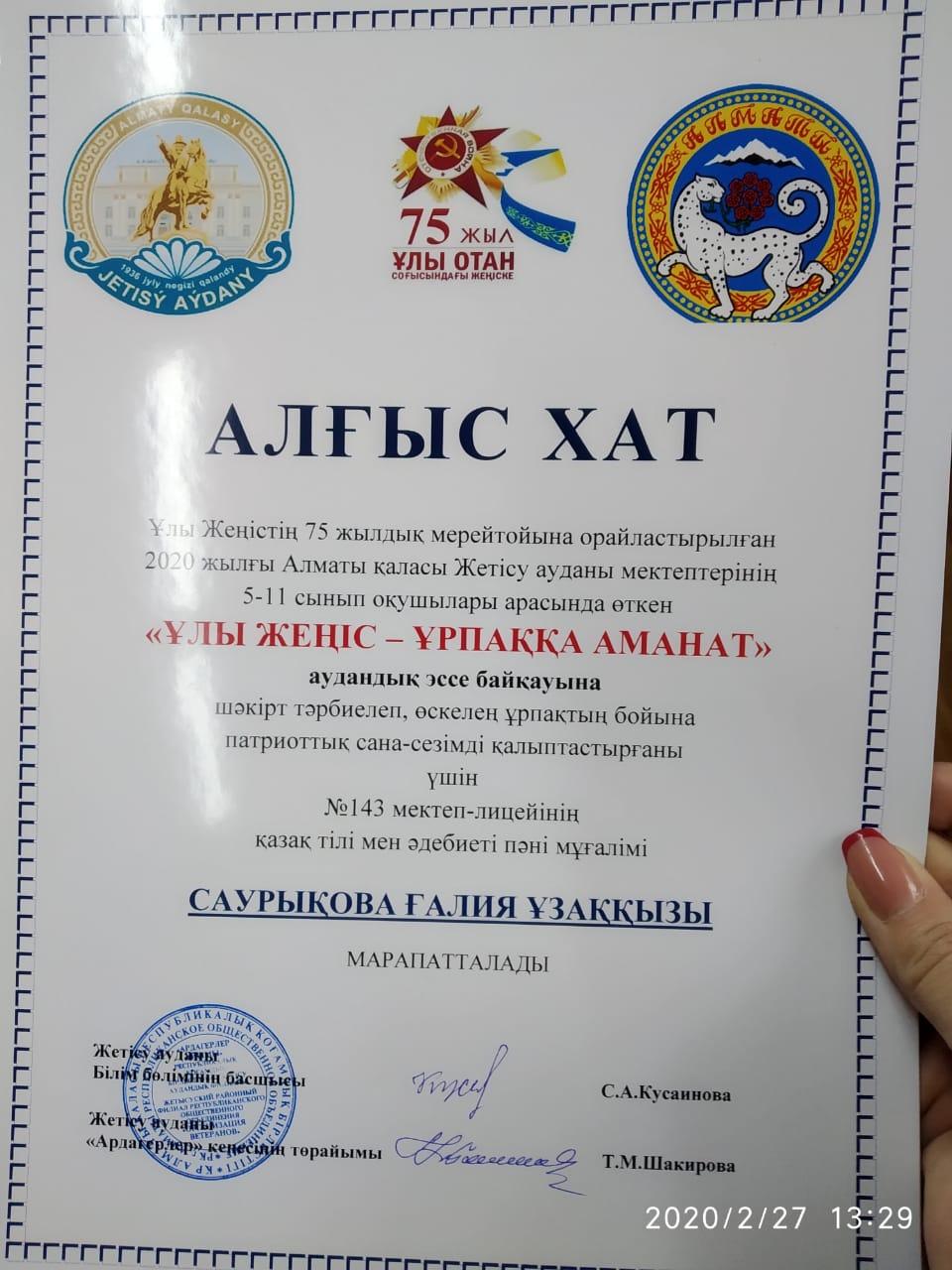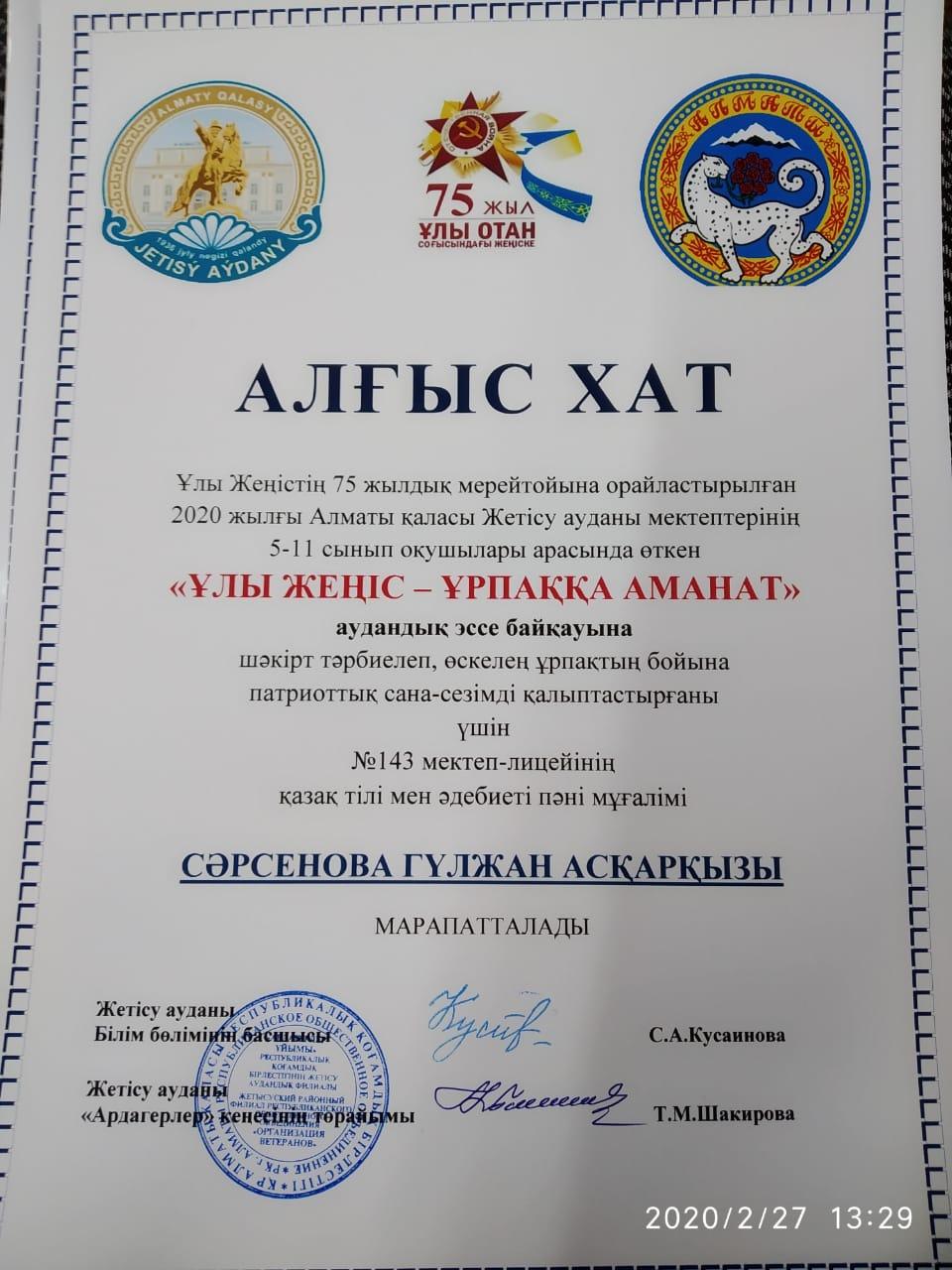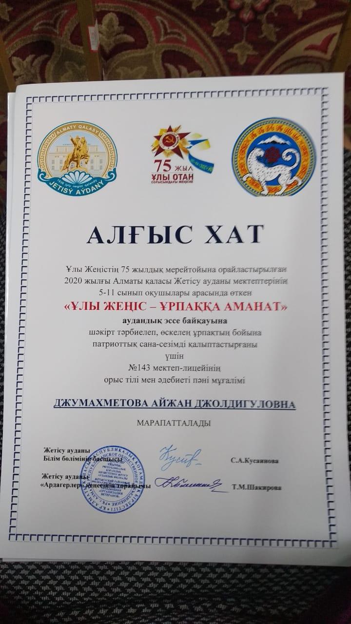 Жетісу ауданы, №102 ЖББ мектепте Ұлы жеңістің 75жылдық мерейтойына арналған,"Ұлы жеңіс-ұрпаққа аманат"атты аудандық эссе байқауына 11"А"сынып оқушысы Сәбит Қарақат, 9"А"сынып Нұржанқызы Асель, 6"А"сынып Шахамаран Марал, 5"Ә"сынып оқушысы Берікқара Әли қатысып, жүлделі І, ІІ, ІІІ орындарға ие болды. Жетекшілері: Орыс тілі мен әдебиеті пәнінің мұғалімдері Джумахметова А. Ж. Мусанова Л. К,қазақ тілі мен әдебиеті пәні мұғалімдері Саурықова Ғ. Ұ. Сарсенова Г. А.
